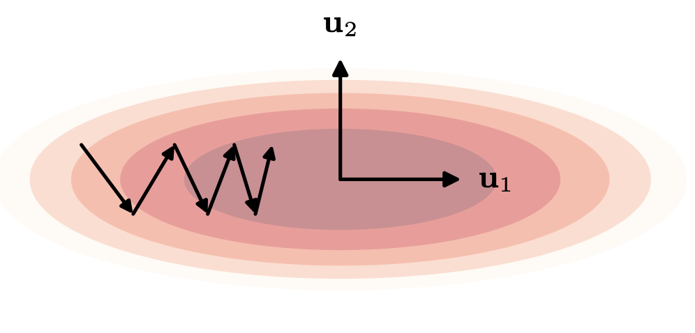 \[\alpha(T)=\Bigl(1-\frac{2\lambda_{\min}}{\lambda_{\max}}\Bigr)^T\alpha(0)\]が収束の律速になる。固有値が小さい軸はパラメータ空間の最小値とのズレ \(\mathbf{w} - \mathbf{w}^*\) が最も更新されにくいことを表しており、つまりパラメータ空間の楕円における長い軸(勾配が小さい、平たい方向)に対応しており、\(\frac{2\lambda_{\min}}{\lambda_{\max}}\) から、最大の固有値と最小の固有値の差が大きいほど収束が遅いことが分かる。